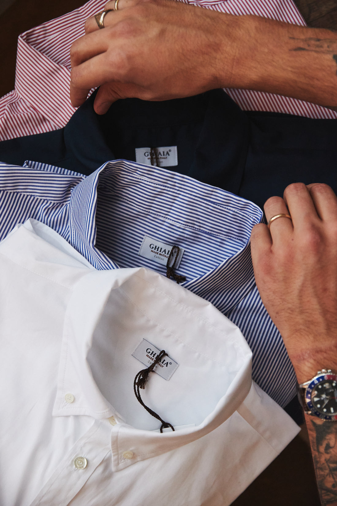 100% Cotton-Poplin ideal for any occasion, casual parties or office attire styled with a knitted tie. Tailored with a classic fit, softer fit, classic button down style with "madreperla" buttons. Perfect length, double buttons on the cuff. Available in four different variants. Our shirt is FATTA IN ITALIA.