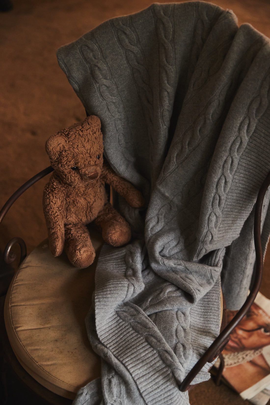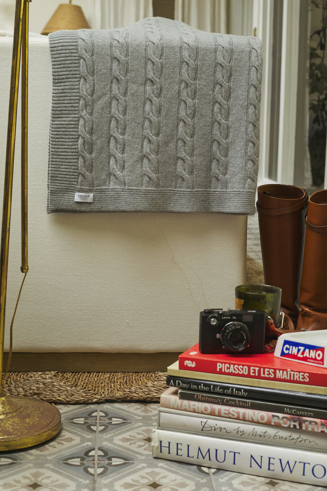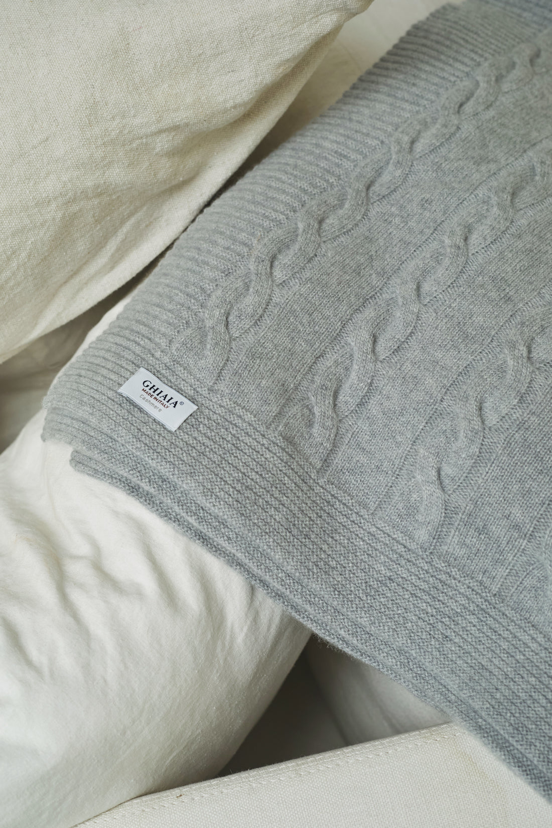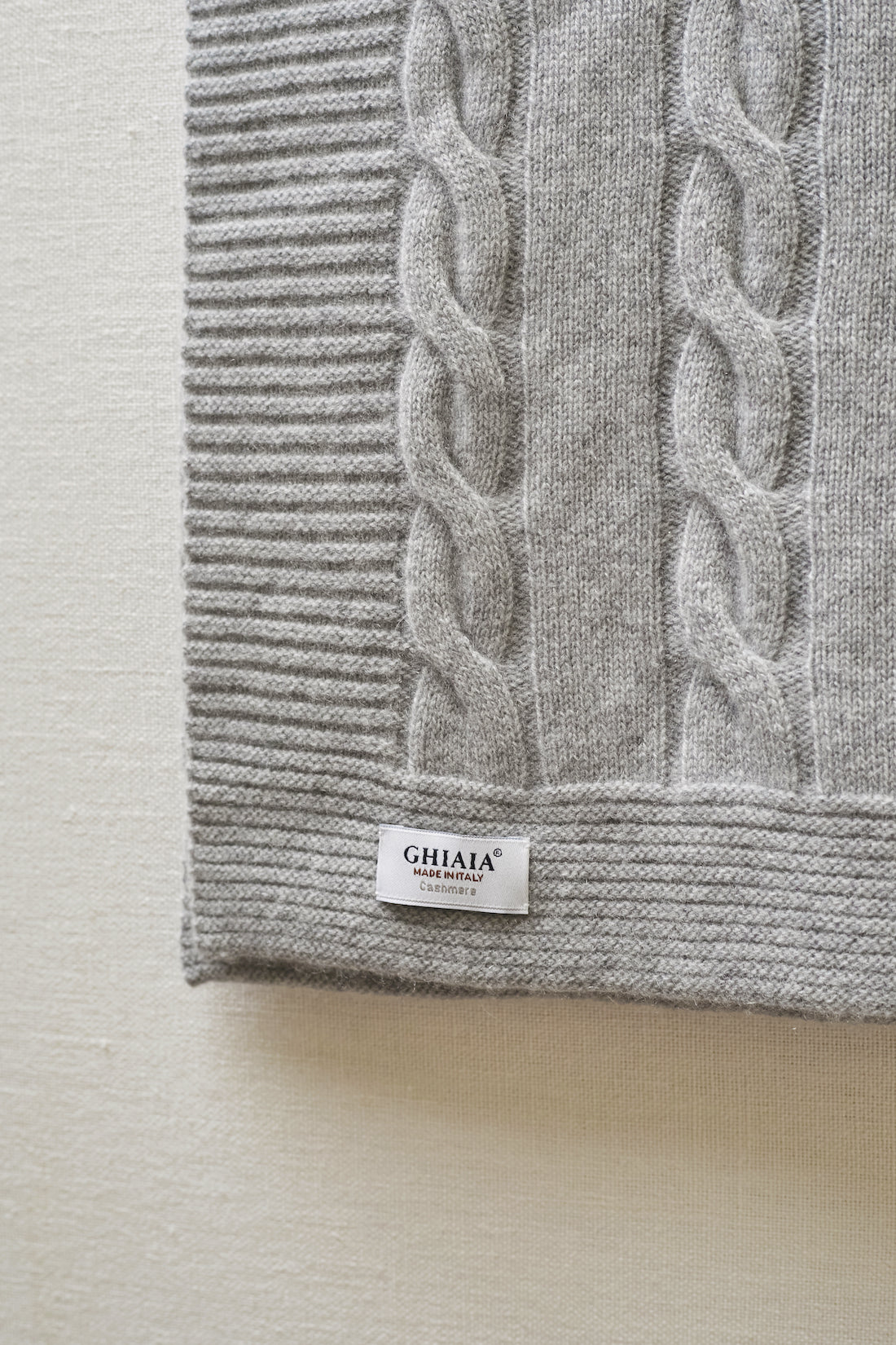 The Ghiaia Cashmere Treccia Cable Blanket is spun from the finest yarns, finished with a treccia cable knit technique. The neutral colors palette will complement a variety of home interiors, convertible cars seats or a boats cushions exterior deck. Ghiaia Casa goods. FATTO IN ITALIA.