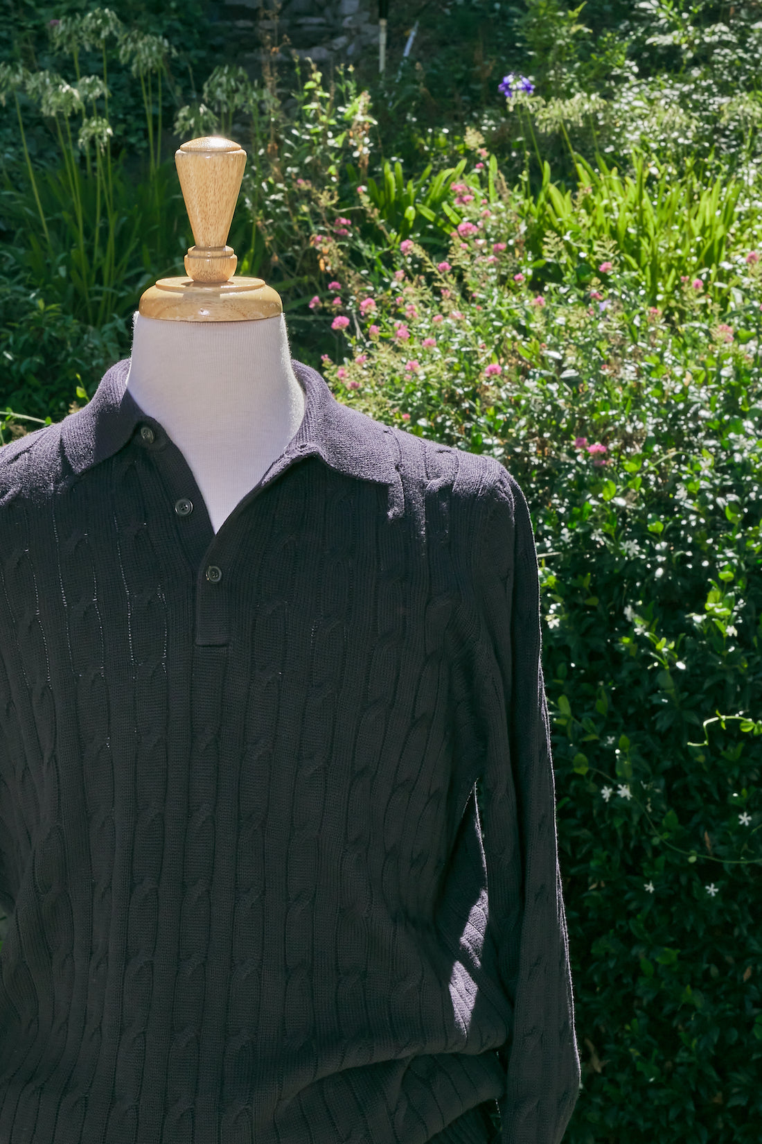 100% cotton cable (Treccia) knitted polo sweater with long sleeves, knitted polo neck, cuffs and hem. The buttons are realized in the highest quality of real black and white horn. Our sweaters fit closer to American sizing, so you don't have to worry about the sleeve or hem length being short. We did this on purpose, to ensure each garment makes you feel your best. Available in 4 colors. Fatto in Italia.
