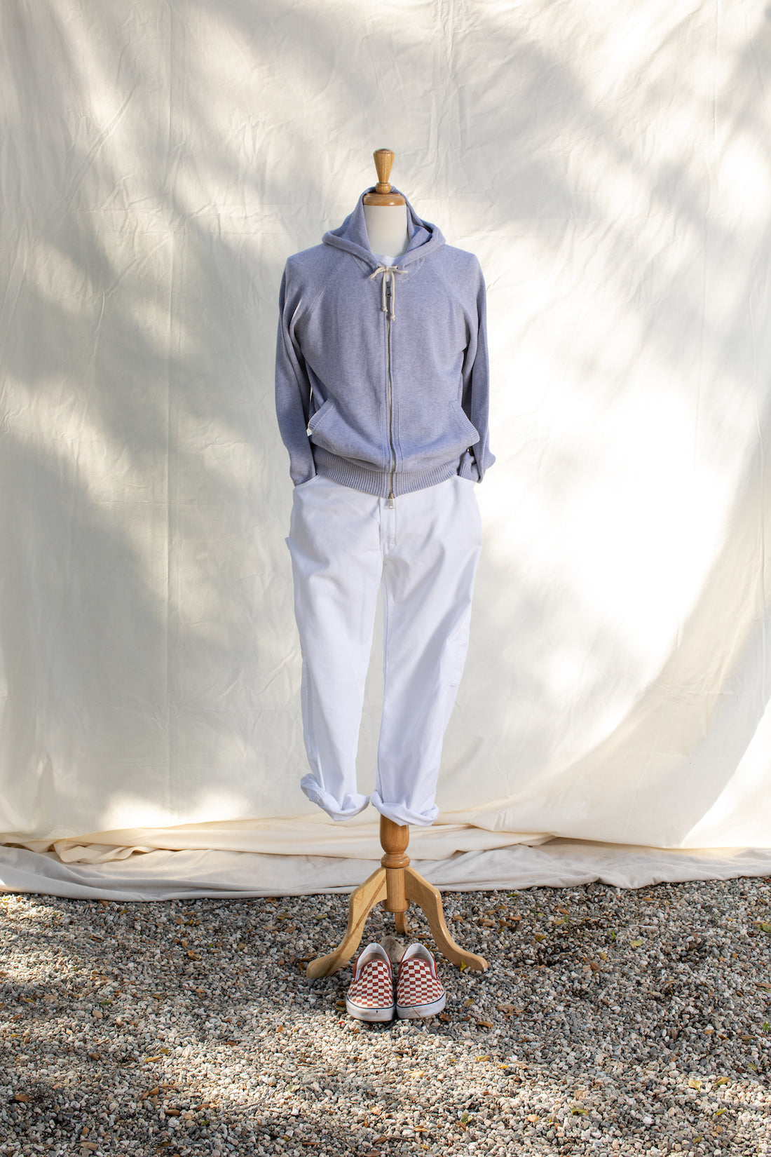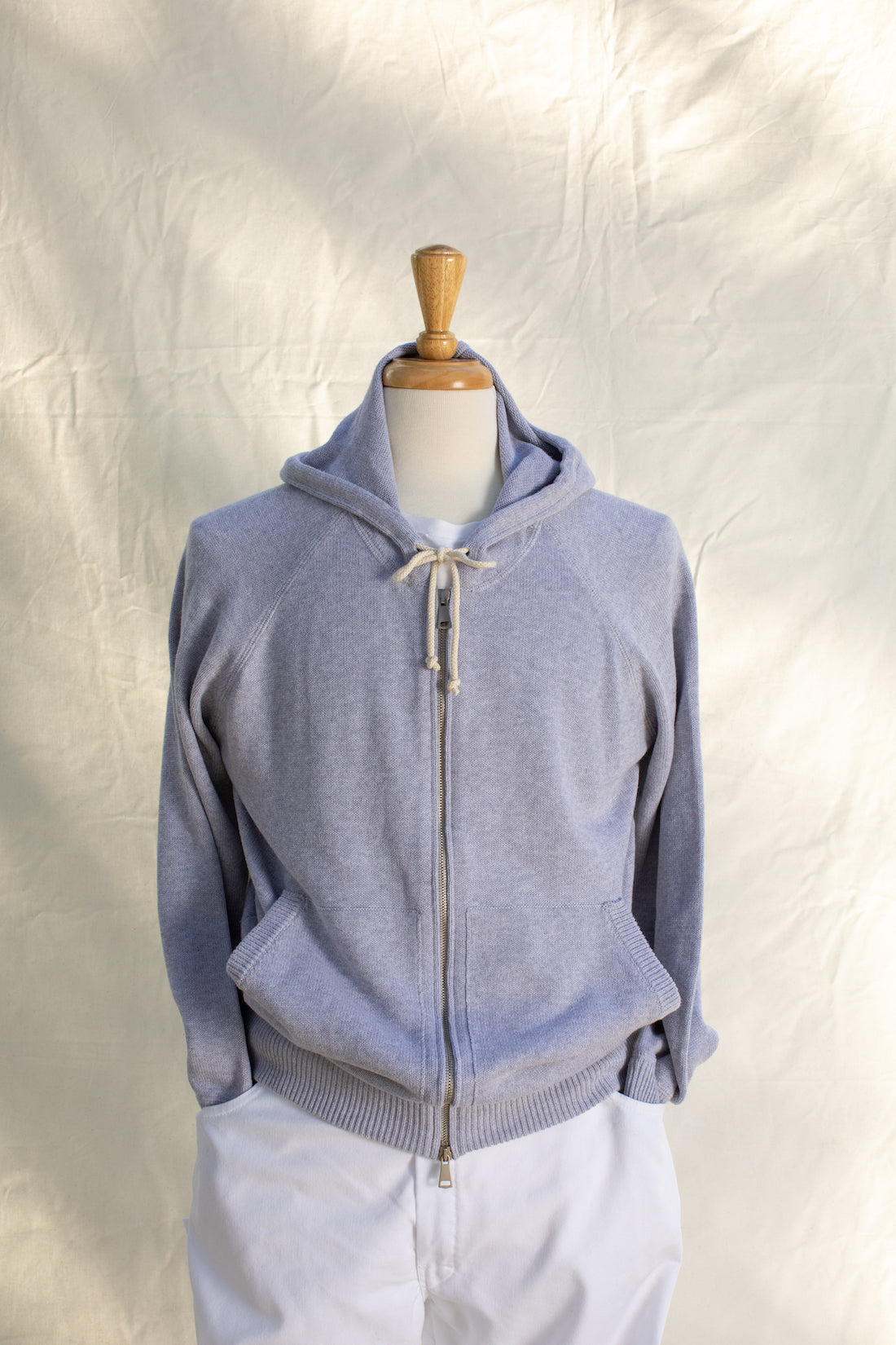 100% very high quality cotton hooded full zip sweater with long sleeves, ribbed neck, cuffs and hem. This item is totally knit - half British rib to be exact. Keeps you warm in the winter, but light enough to carry you through summer. It's a great year-round sweater. Our sweaters fit closer to American sizing, so you don't have to worry about the sleeve or hem length being short. We did this on purpose, to ensure each garment makes you feel your best. Fatto in Italia.
