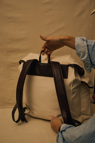 Crafted in Italy with meticulous attention to detail, this Ghiaia canvas-leather backpack adds a touch of style to your travels. Multiple compartments keep essentials organized, large pockets, adjustable shoulder straps enhance comfort and versatility. Grained Calfskin details. 60lt capacity. Fatto in Italia da materiali Italiani.