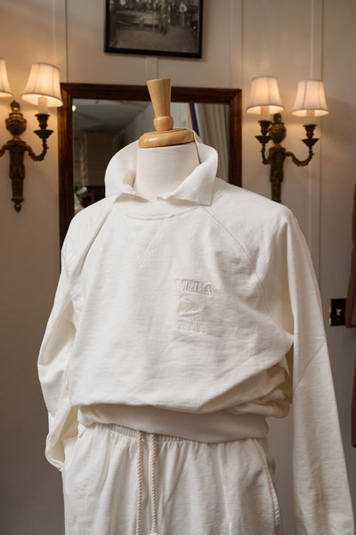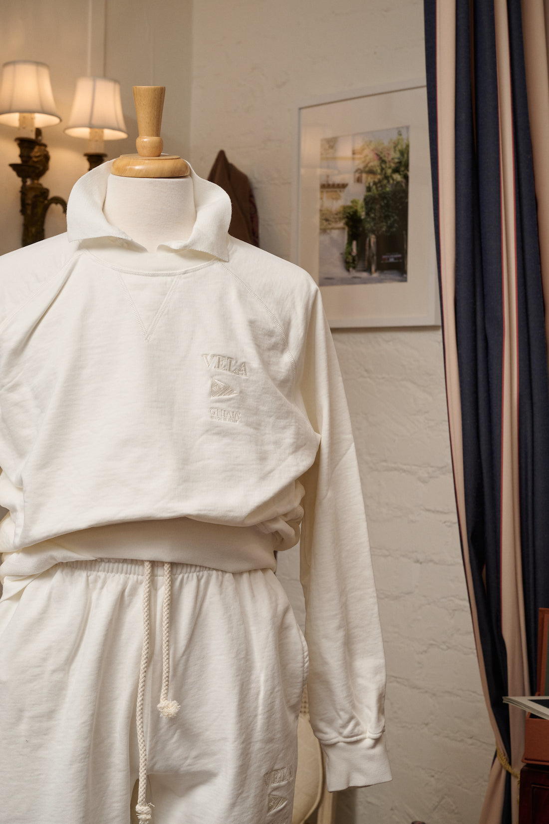VELA Cotton Raglan Crewneck Sweatshirt has been made in Italy from a 400gr. french terry cotton cloth soft, warm and breathable. Ribbed collar, cuffs & hem and Embroidered tonal VELA logo, inspired by varsity retro style. Available in two colors, wear it with the matching available sweats. Fatta in Italia da materiali italiani.